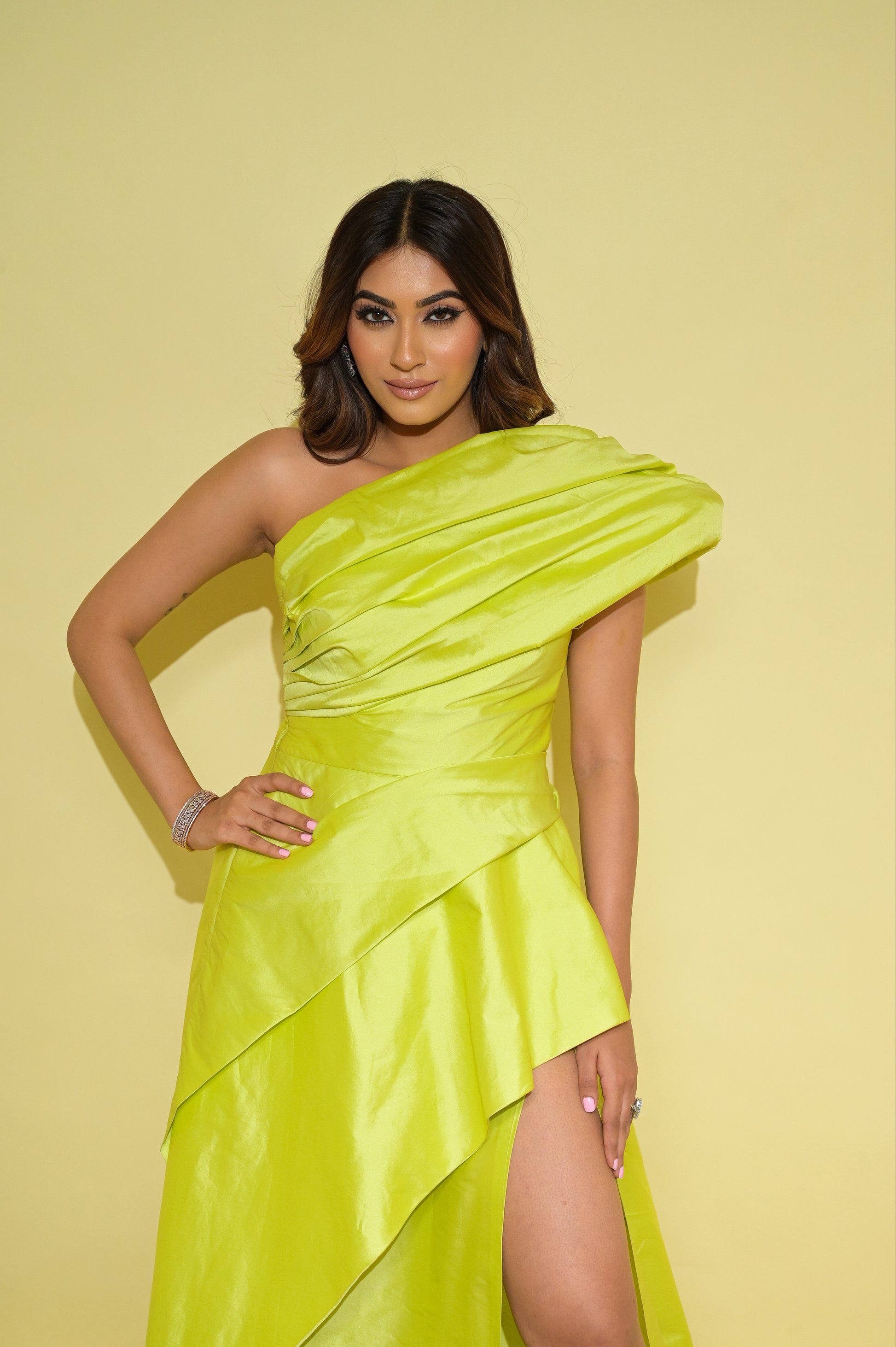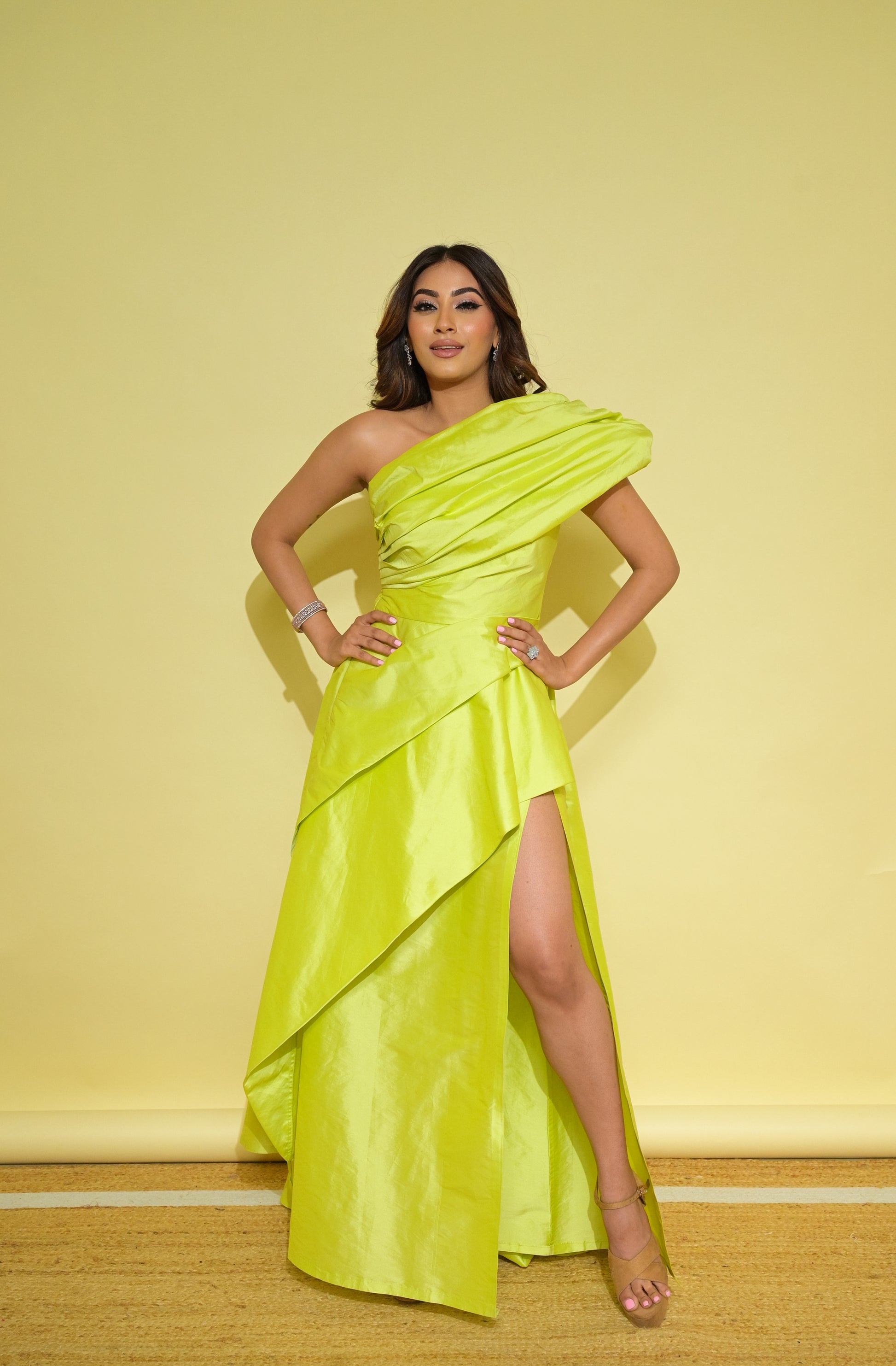 The skirt is long and flowing, with a significant high slit on one side that adds a touch of allure and allows for ease of movement. The fabric appears to be a smooth, possibly satin or a similar material, which catches the light and accentuates the gown's vibrant color and dramatic folds.
