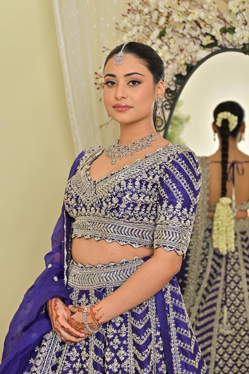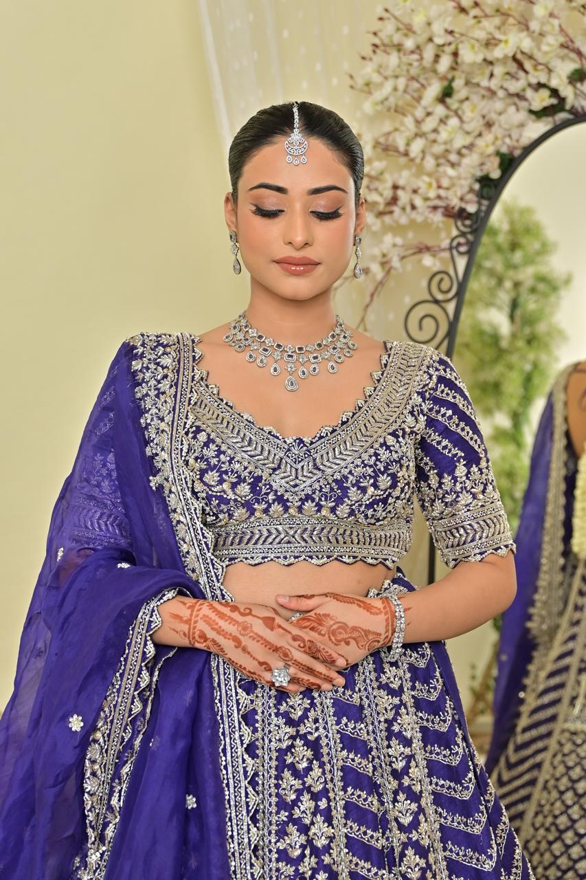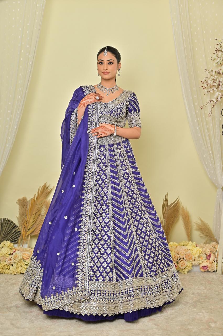 The Dupatta (Veil/Scarf): A matching royal blue dupatta completes the outfit. It is made of a sheer fabric and features a heavily embroidered border that complements the lehenga and choli. The main body of the dupatta may also have scattered embellishments.