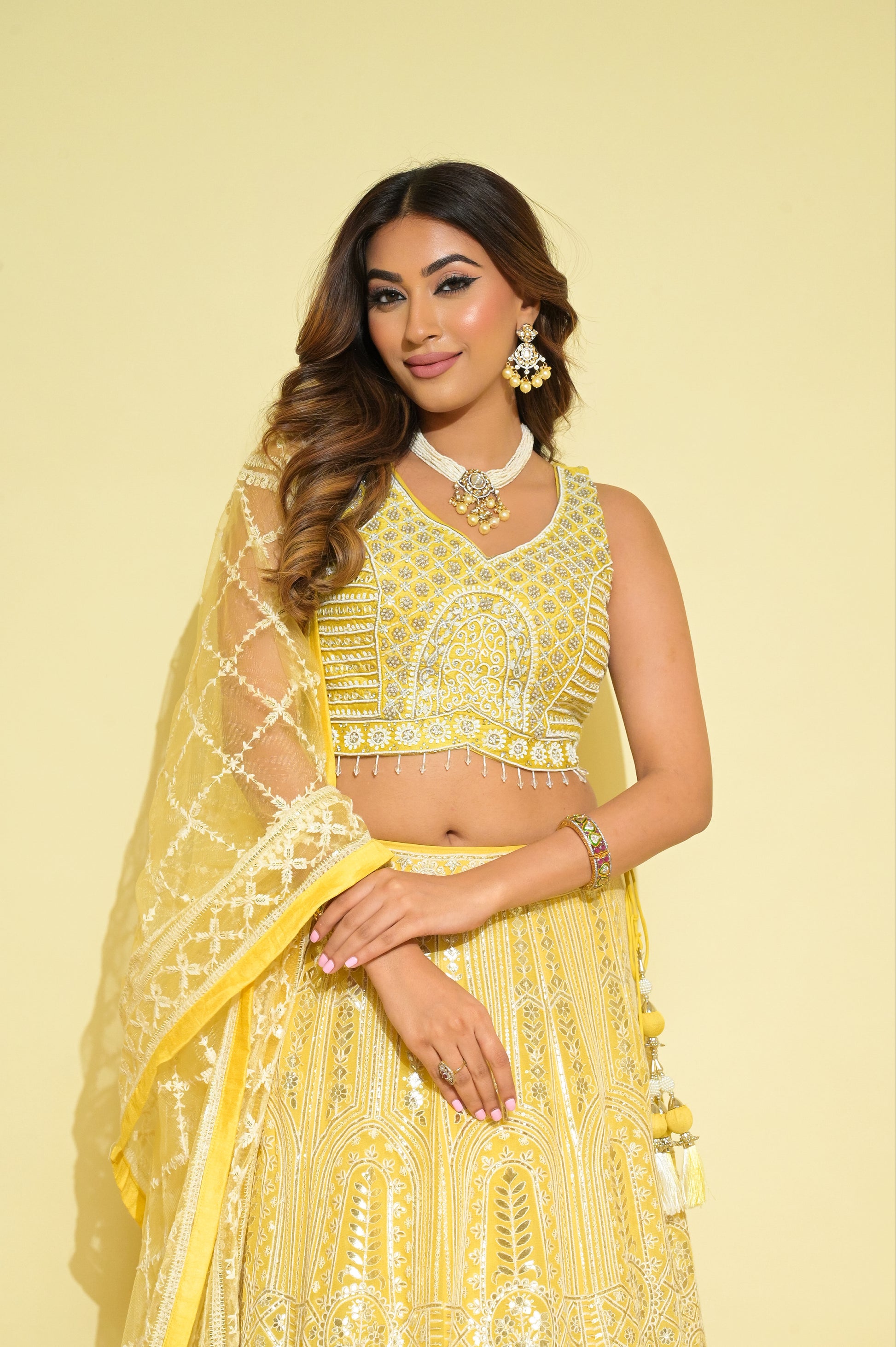 The Choli (Top): The top is a sleeveless, cropped blouse in a cheerful light yellow color. It features a V-neckline and is heavily embellished with intricate detailing, possibly including sequins, beads, or embroidery, creating a textured and shimmering effect.