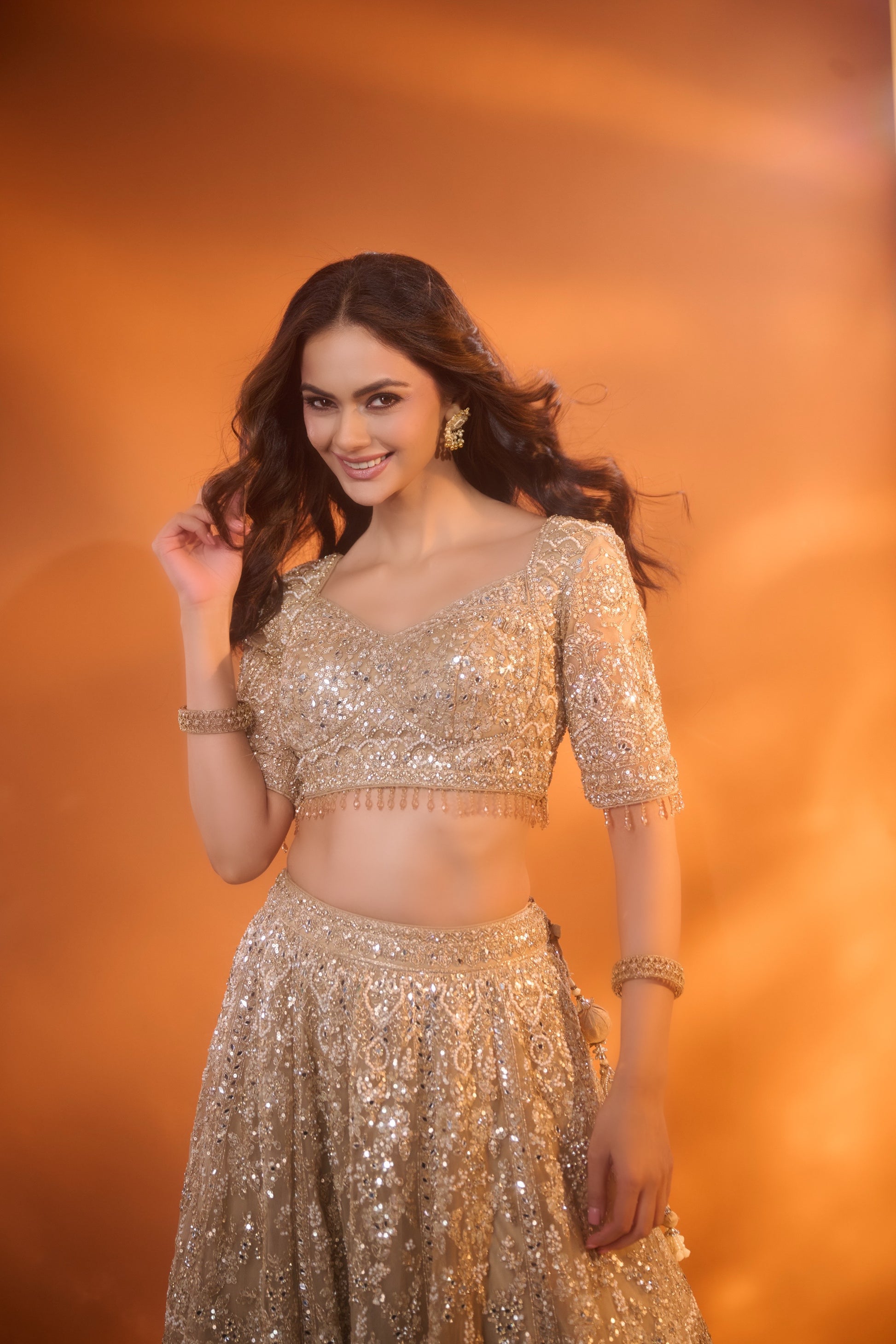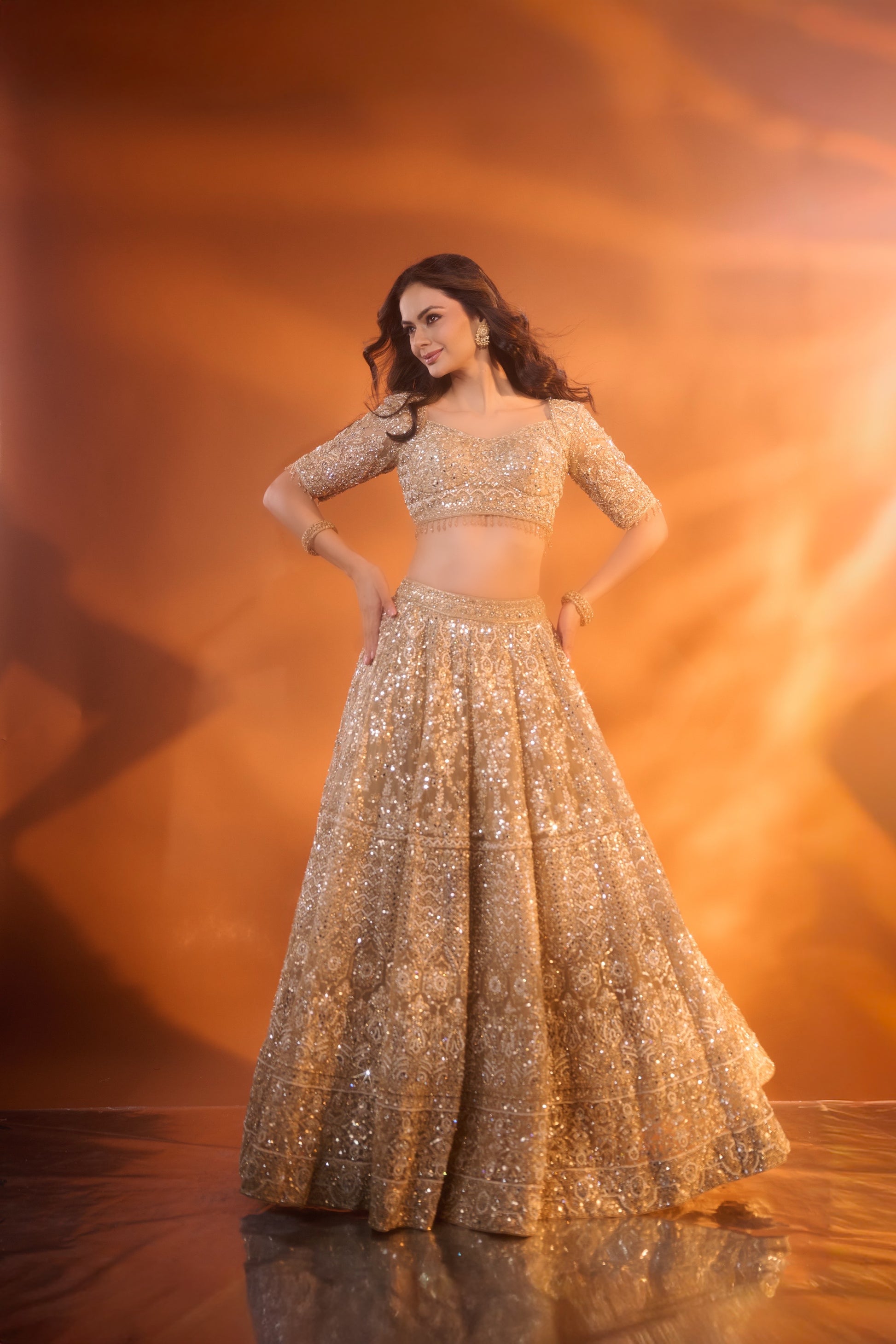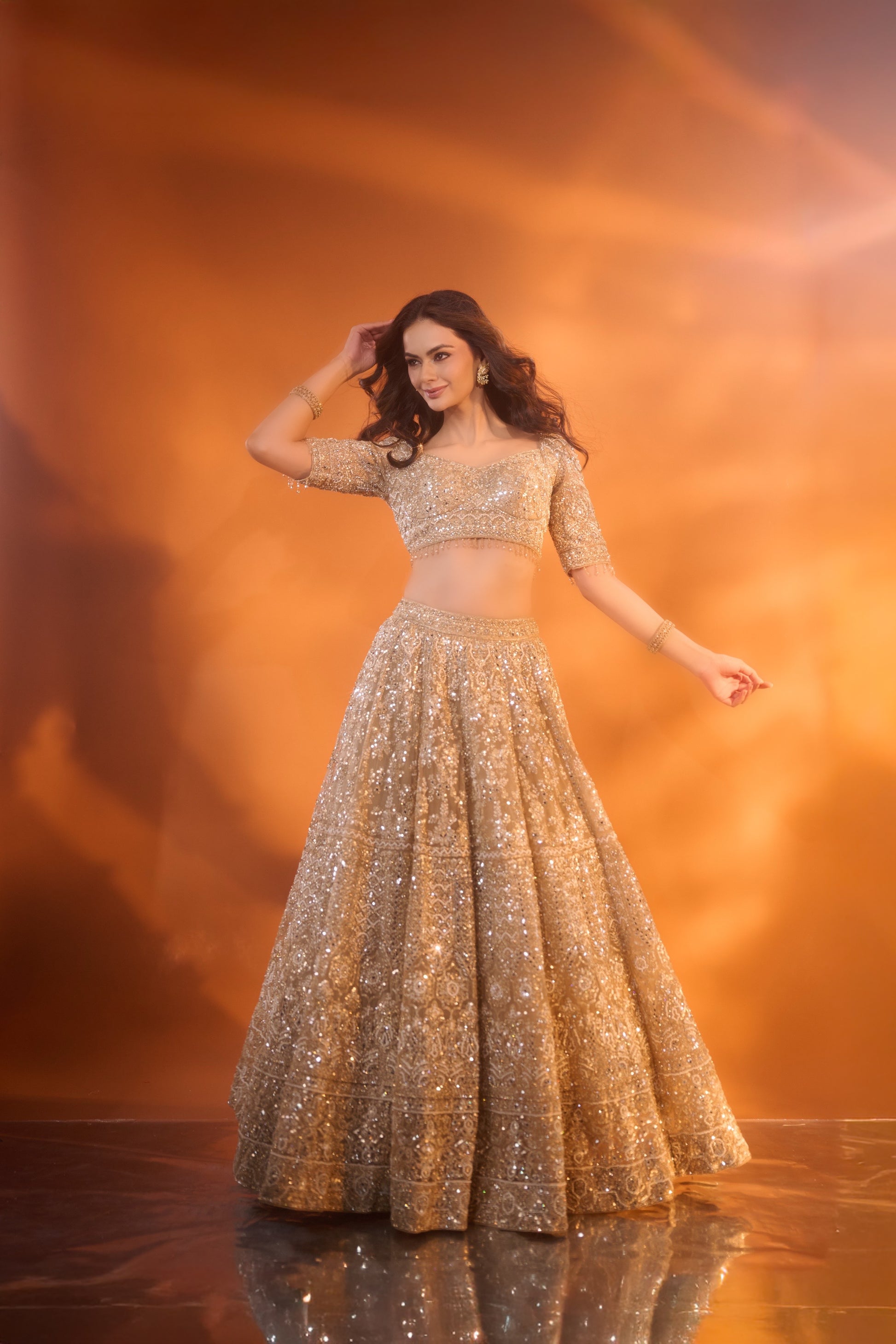 The Lehenga (Skirt): The skirt is a high-waisted, flowing A-line maxi skirt in a matching champagne, gold, or light bronze hue. It continues the theme of extensive embellishment, mirroring the intricate work seen on the choli. The skirt's volume and the all-over sparkle contribute to a very festive and luxurious look.
