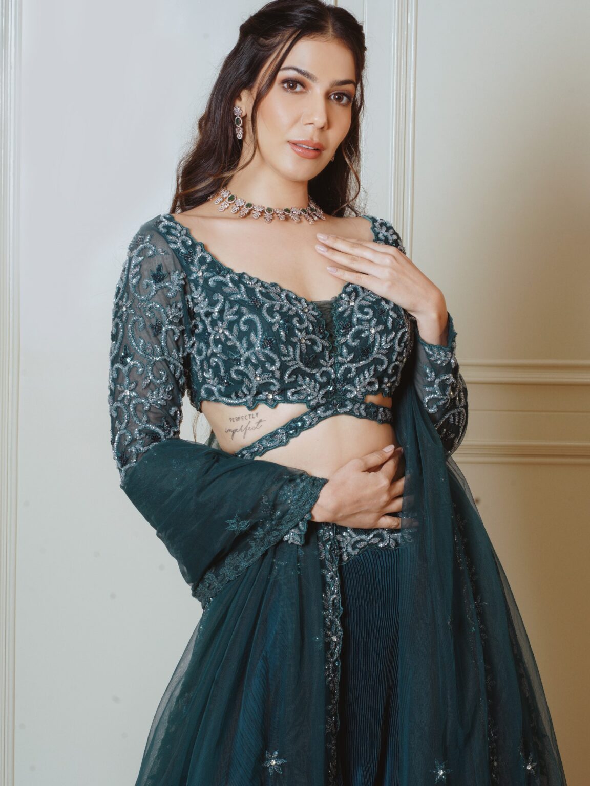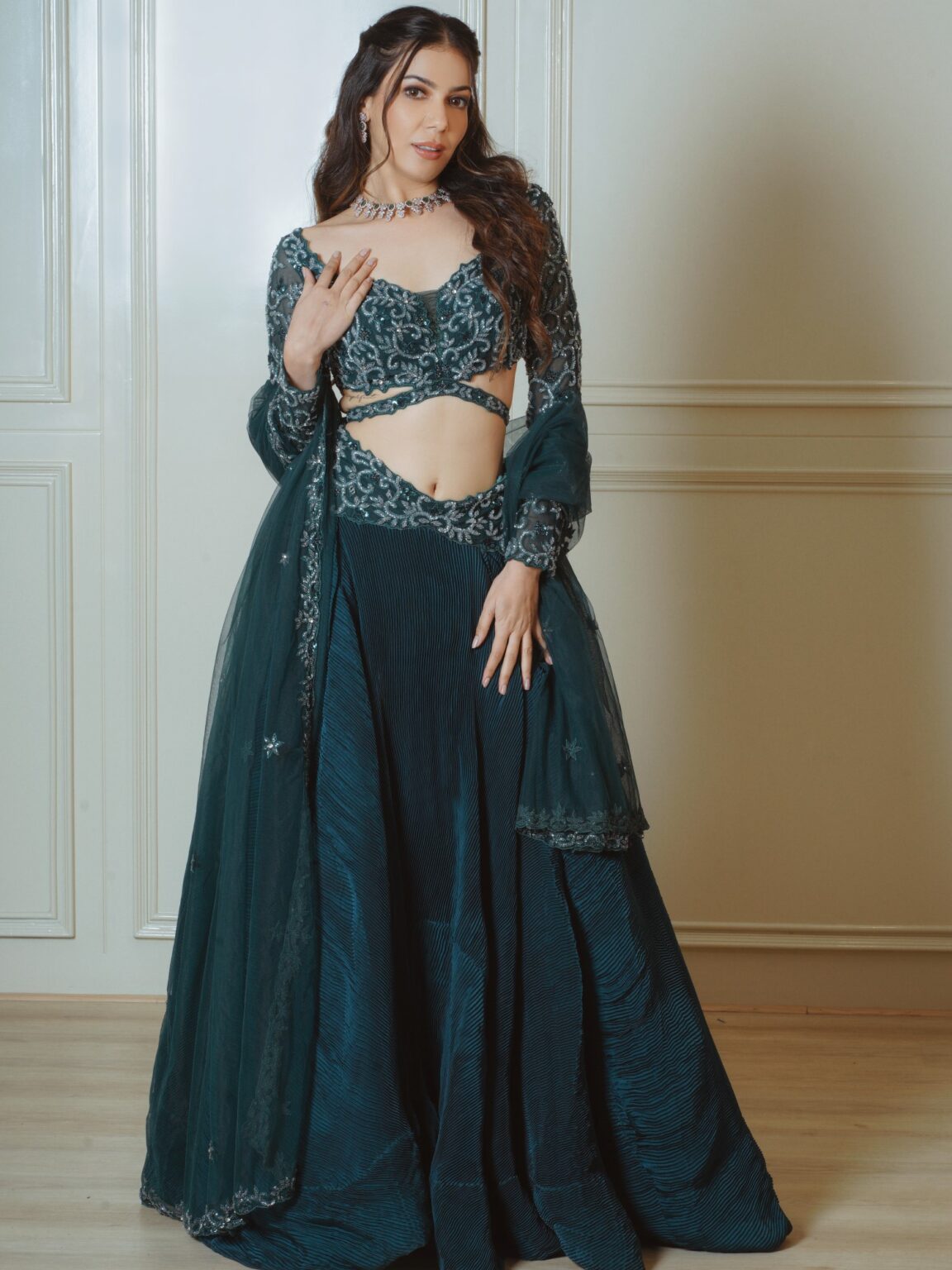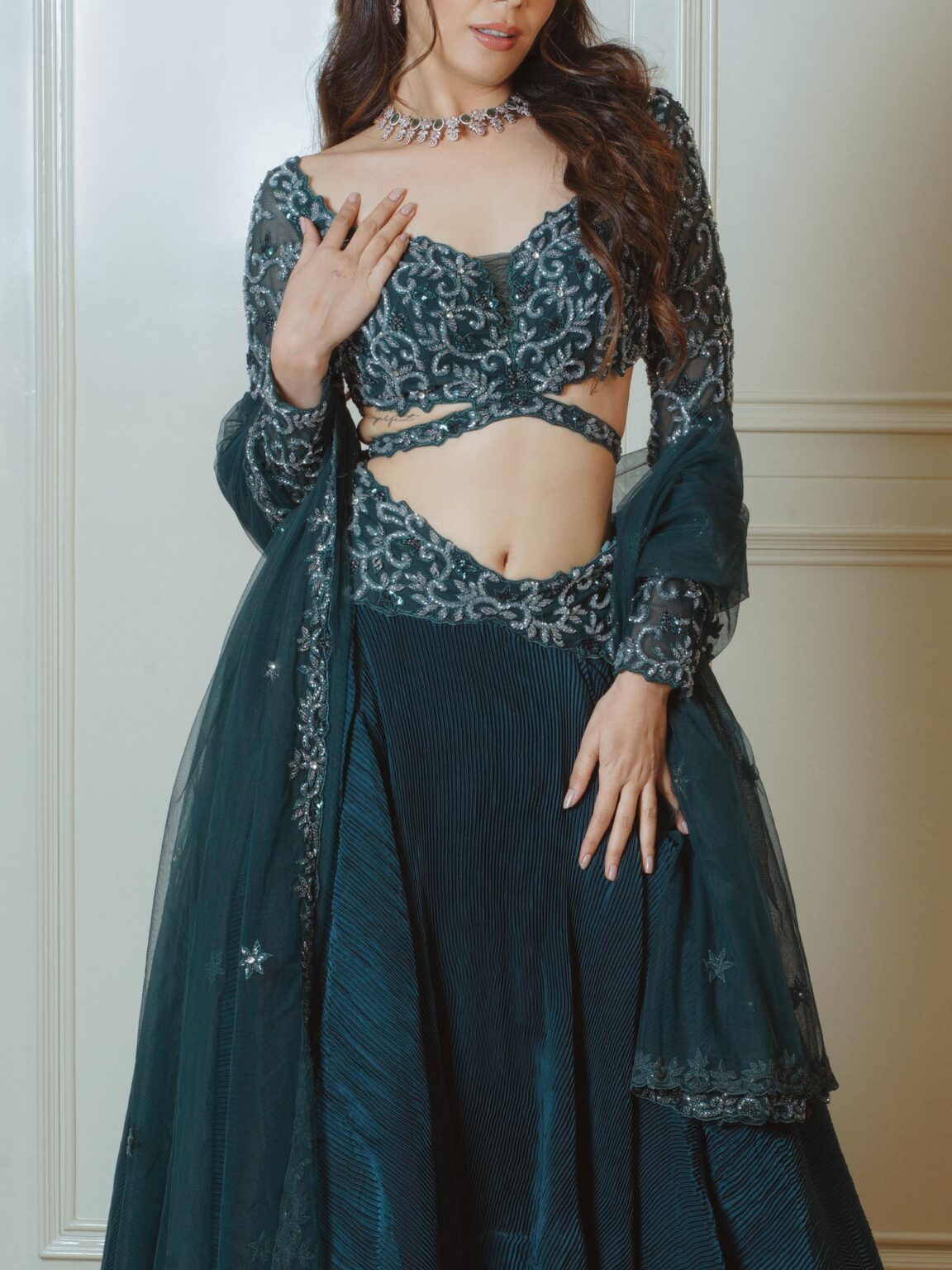 - Flowing teal lehenga with textured fabric and embellished waistband