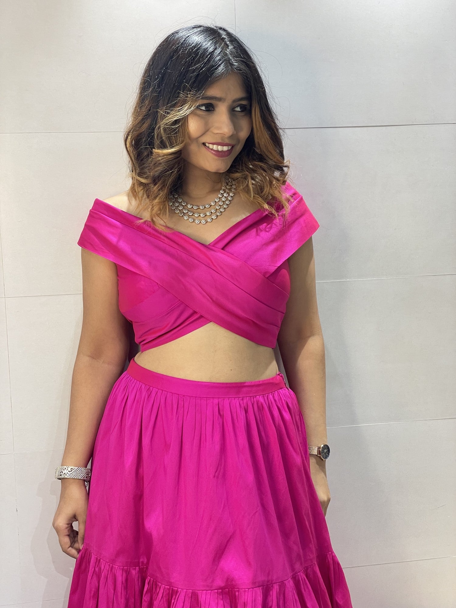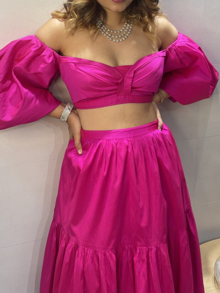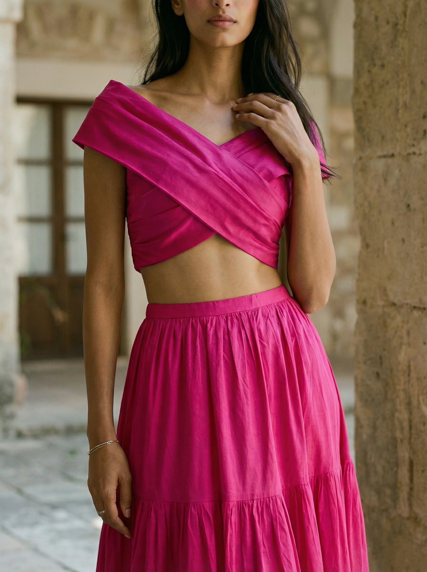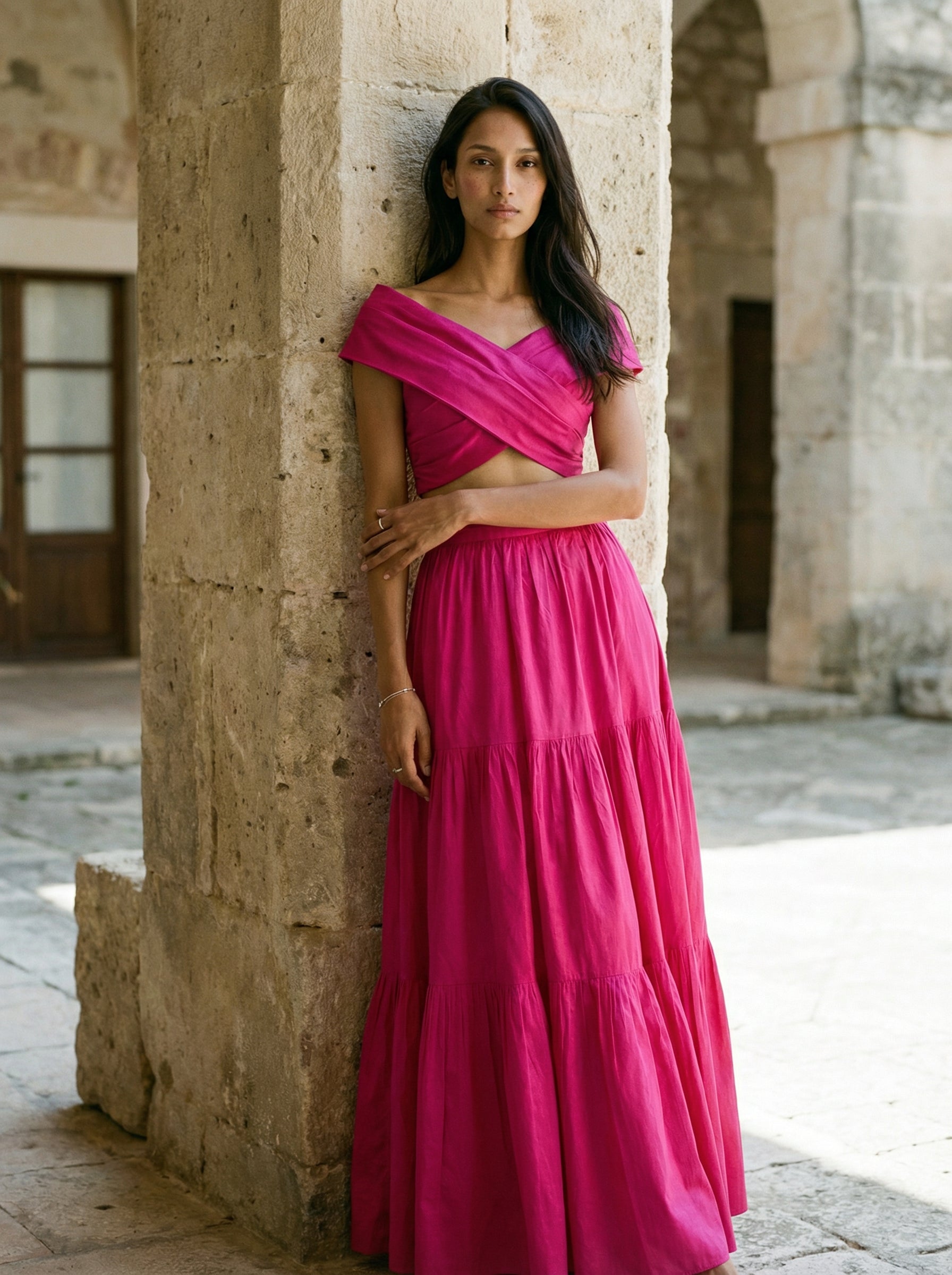 The skirt is a high-waisted, tiered maxi skirt in a matching magenta fabric. It has multiple flowing tiers that add volume and movement, creating a graceful and eye-catching silhouette. The defined waistband complements the cropped top.