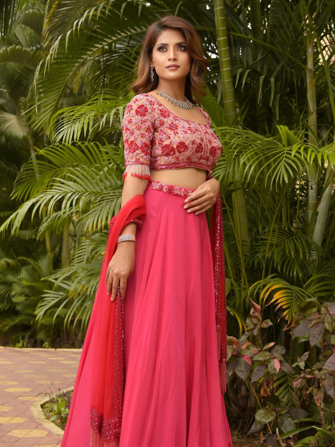 - Flowing solid pink lehenga with a wide, decorative embroidered border
