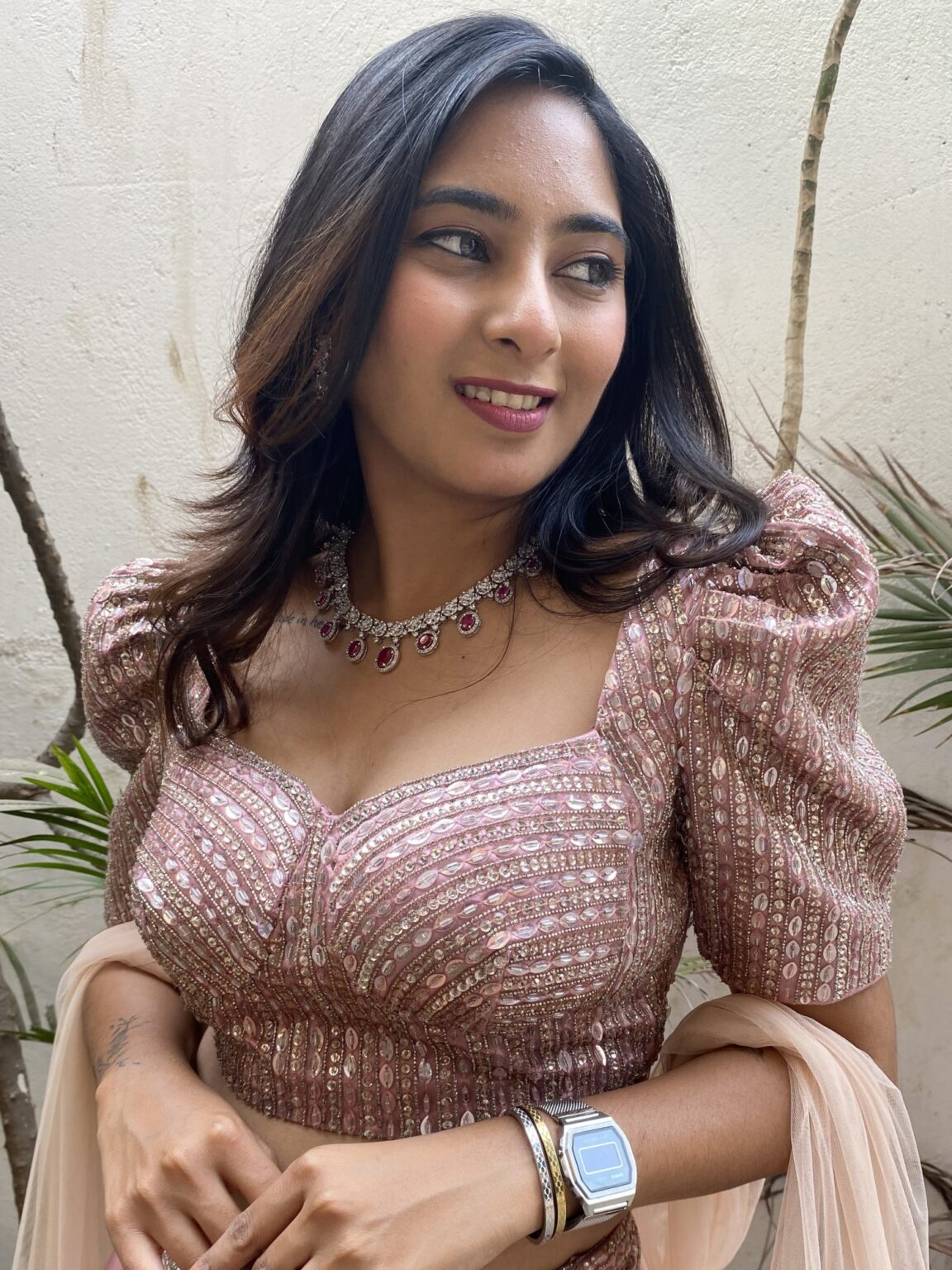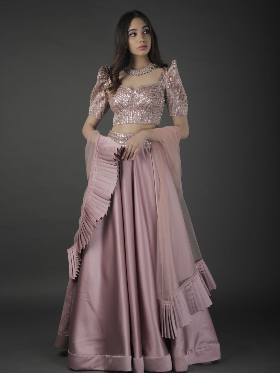 This sophisticated dusty rose lehenga set offers a modern take on traditional Indian attire with its unique textural elements. The outfit features a cropped choli (blouse) that appears to be heavily embellished with sequins or small beads, creating an all-over shimmer. It has a sweetheart neckline and distinctive short sleeves with a puffed or gathered detail at the shoulders, adding a touch of contemporary flair.
