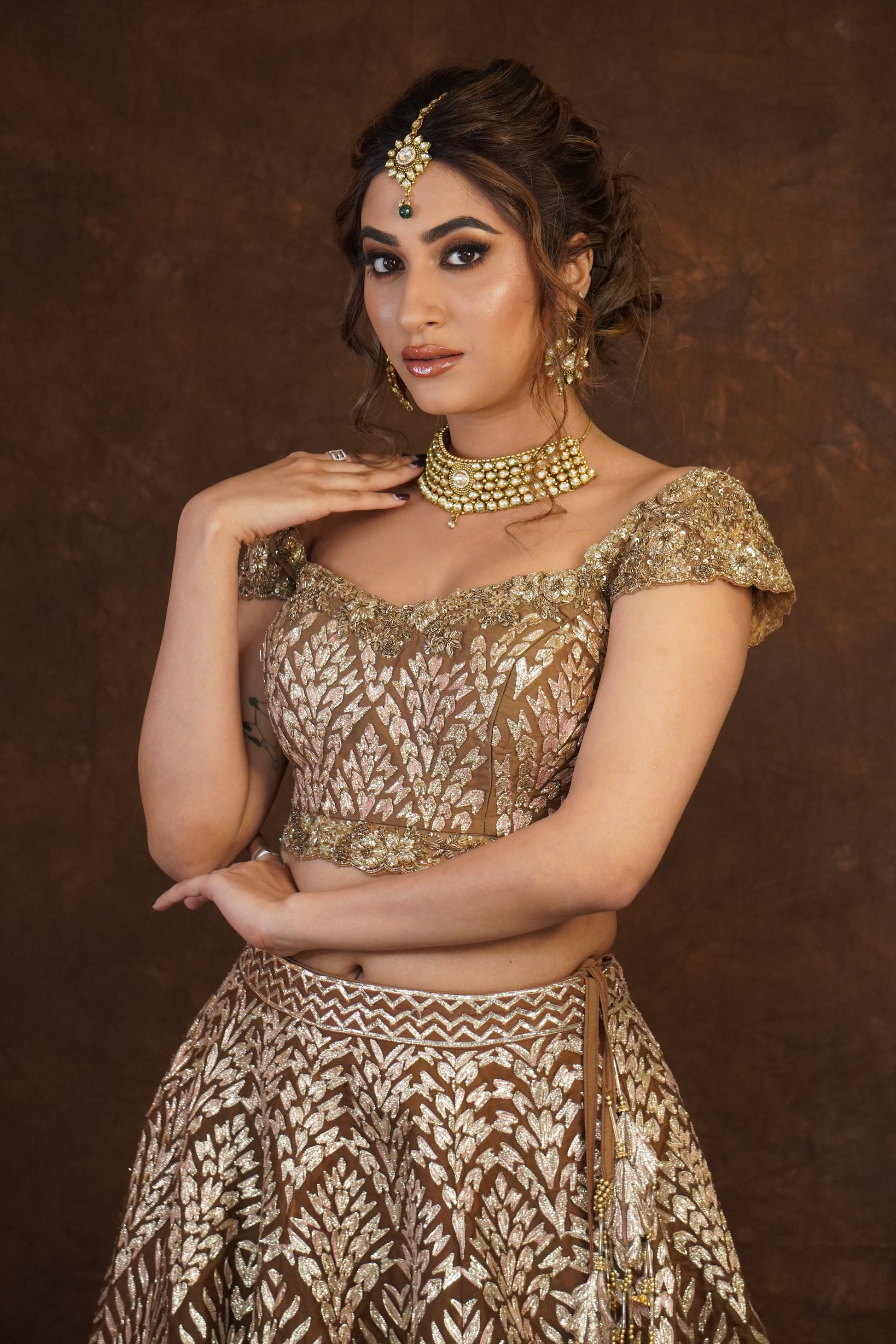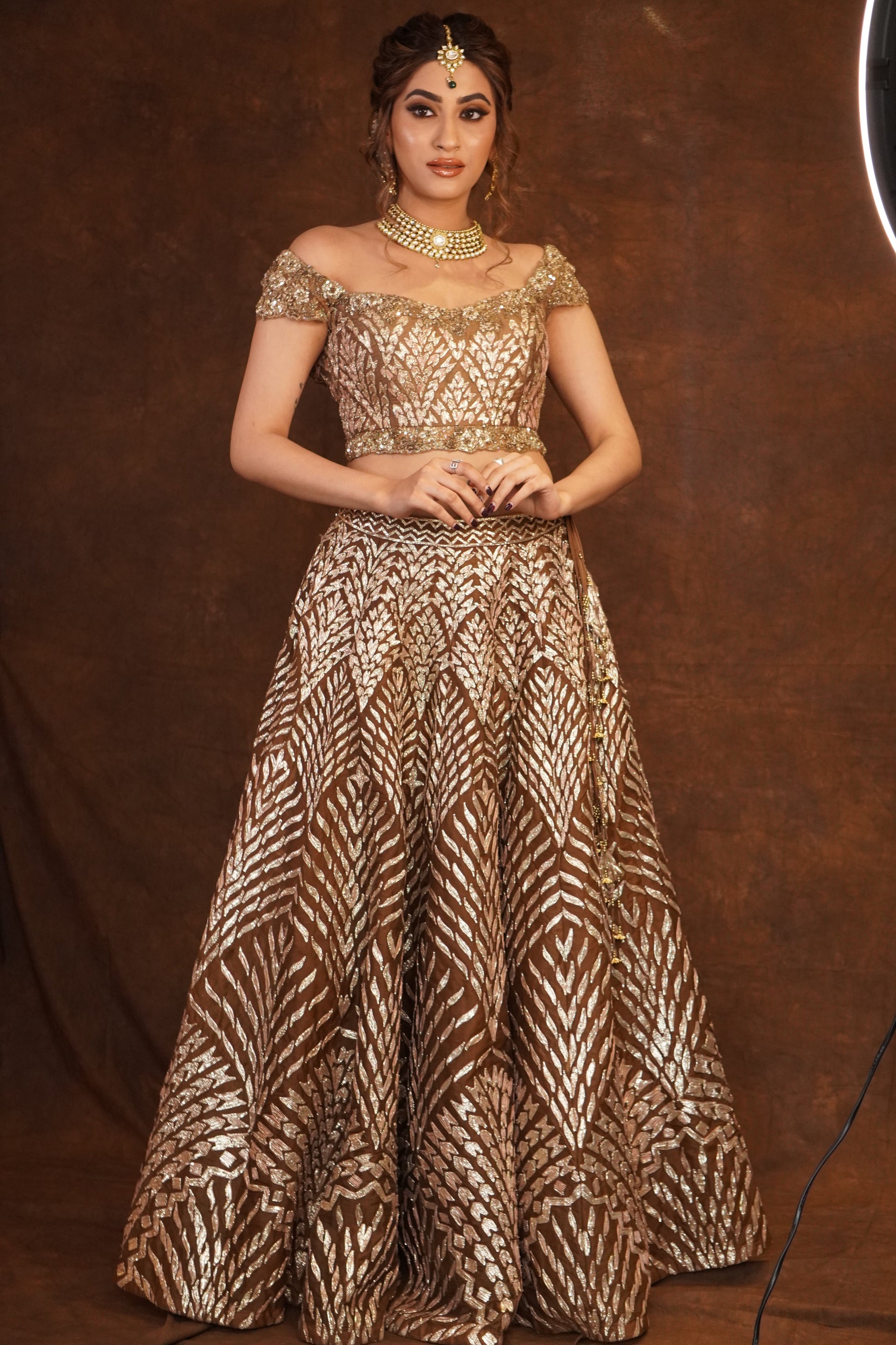 The Lehenga (Skirt): The skirt is a voluminous, A-line maxi skirt in the same brown or bronze hue as the choli. It continues the elaborate gold or light-colored embellishment in a coordinated pattern that complements the top. The design on the lehenga is also geometric and possibly botanical, creating a cohesive and grand appearance. The skirt has a defined waist and flows out dramatically.