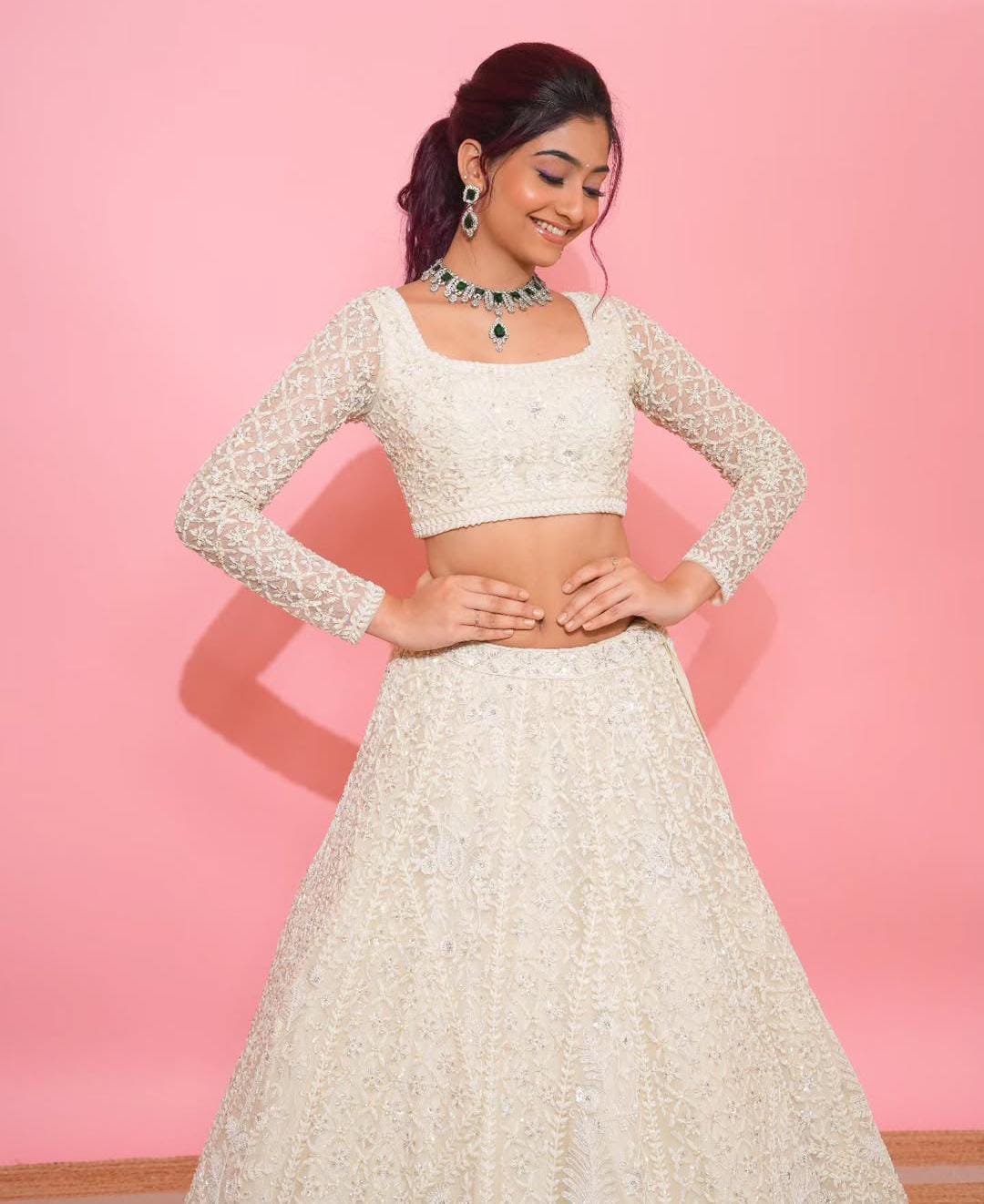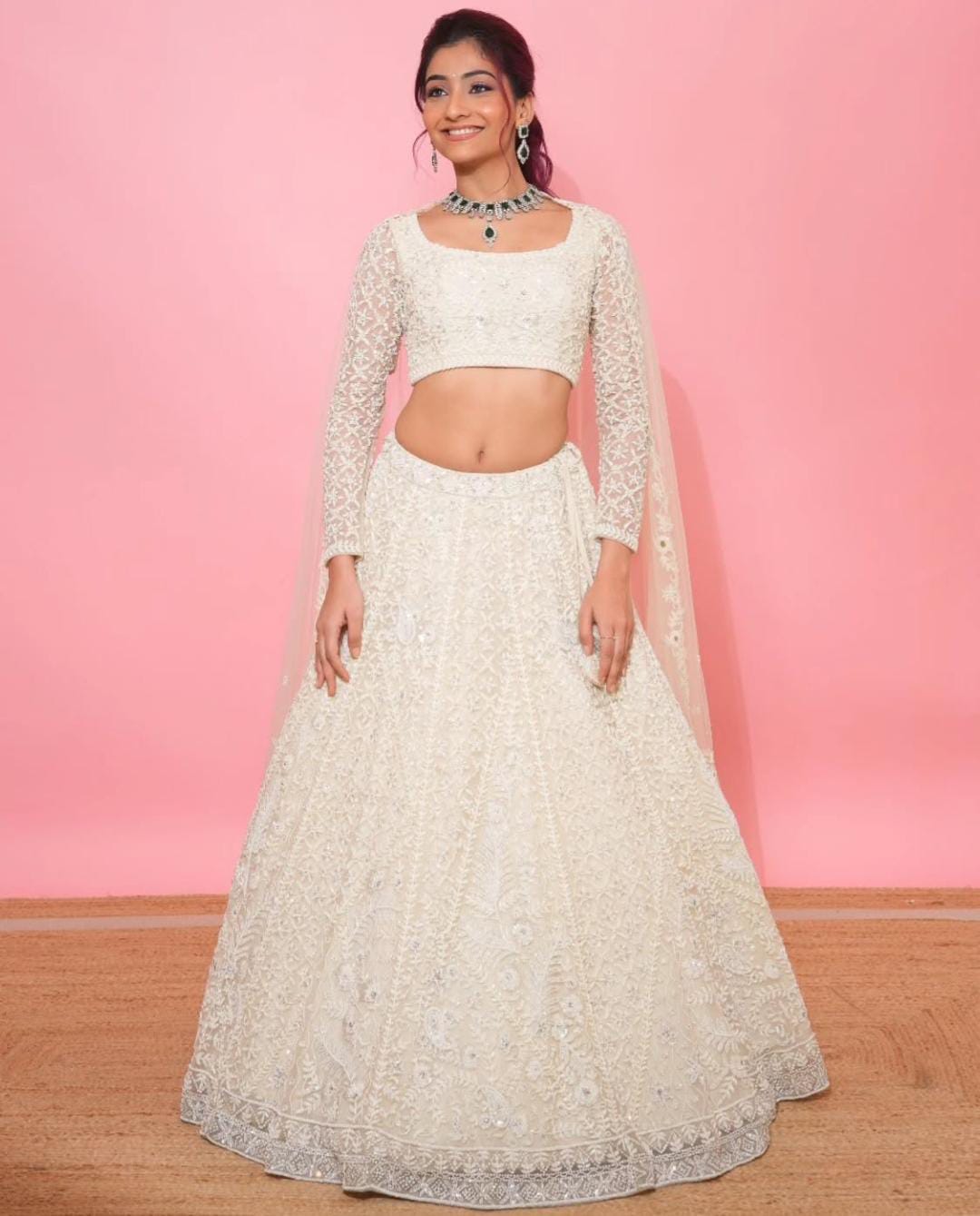 The choli, a crop top-style blouse, has a square neckline and long sleeves made of a sheer fabric that is also embroidered with delicate patterns. The midriff is exposed, a common style for lehenga cholis.