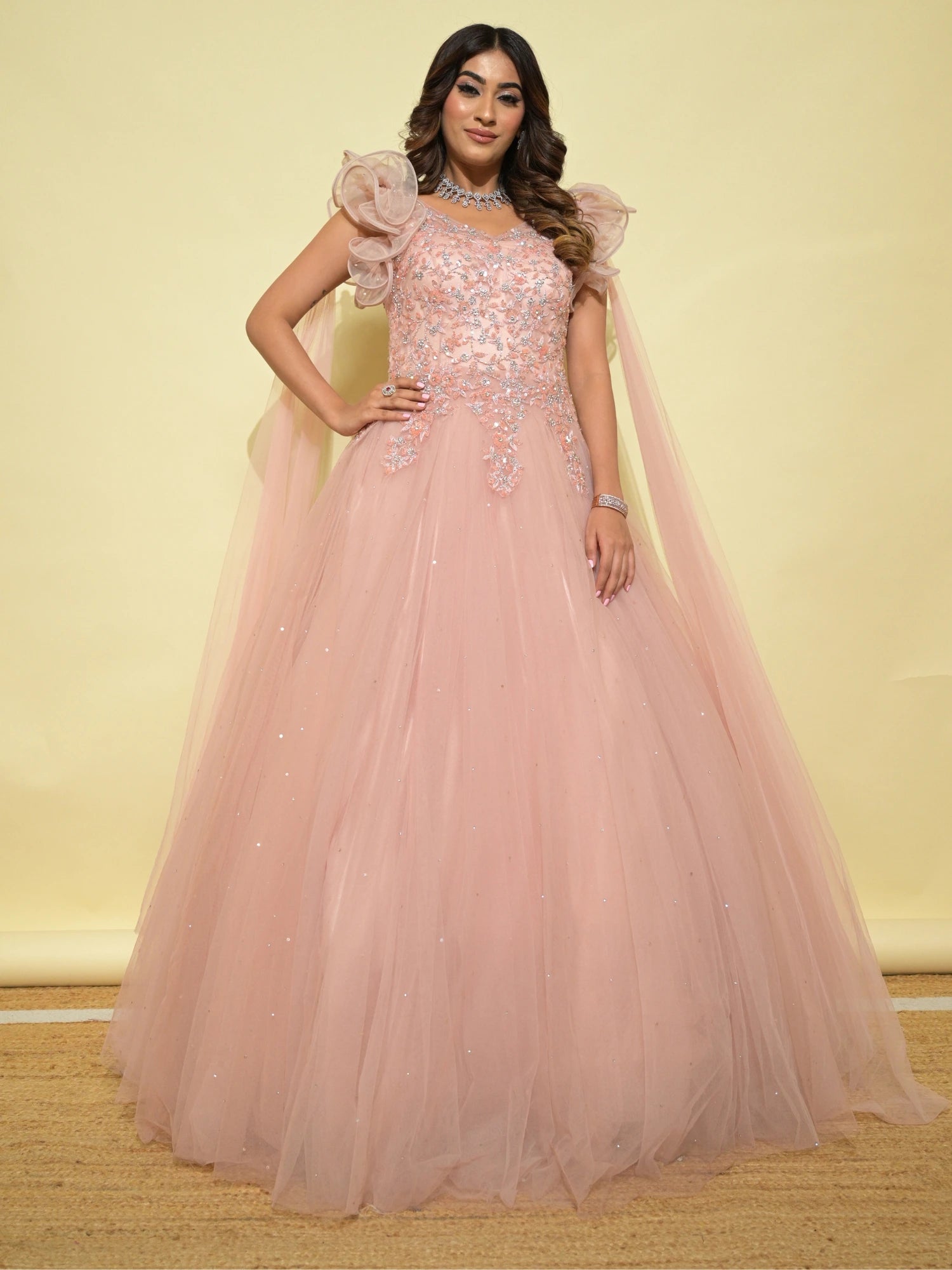 Step into your fairytale moment with this ethereal blush pink ball gown, a perfect blend of elegance and whimsy. Designed for receptions, cocktail nights, or modern bridal looks...