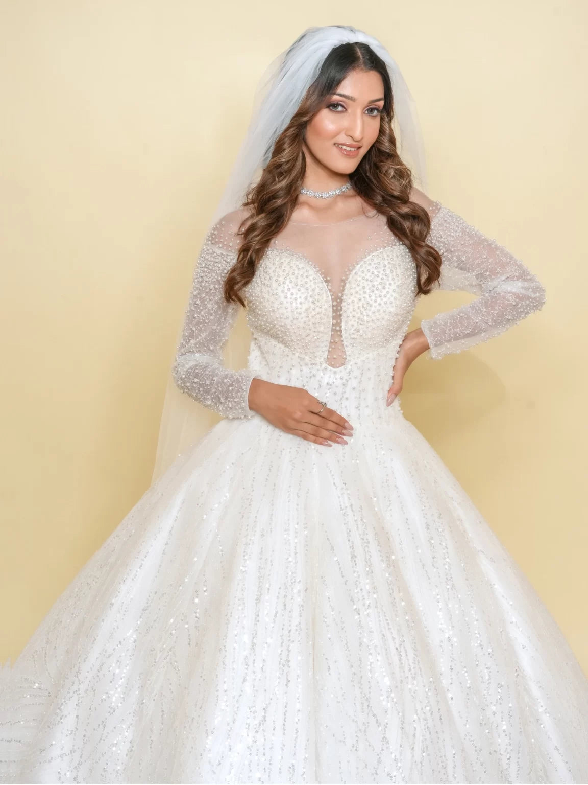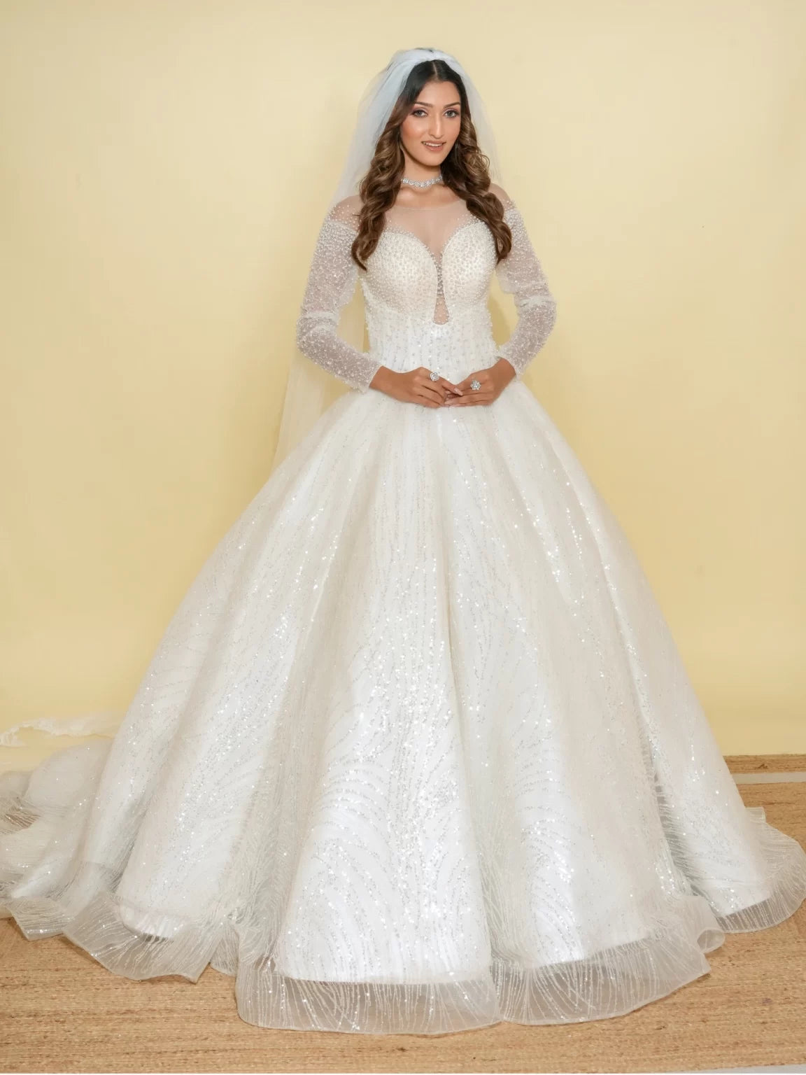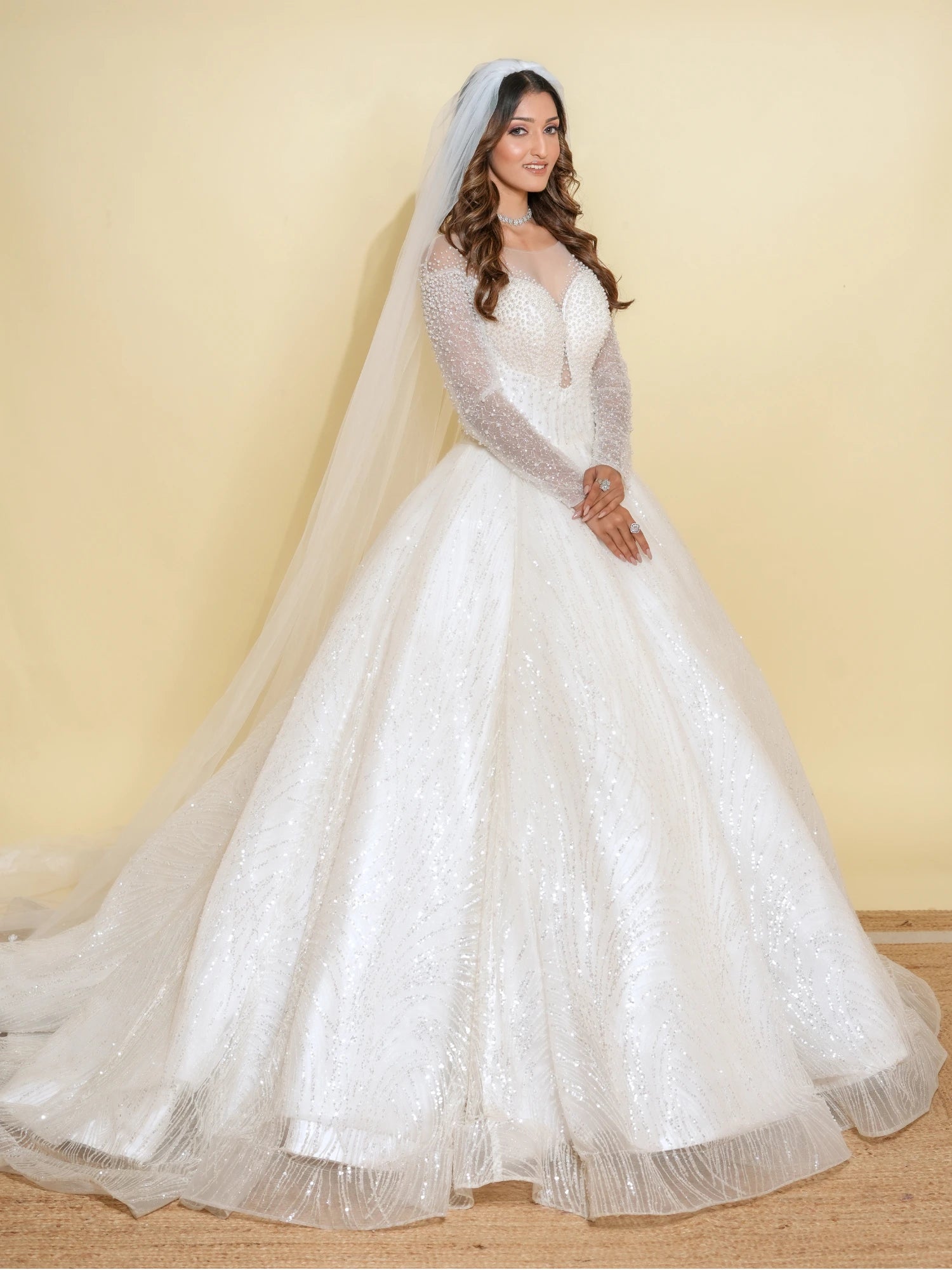 This enchanting white wedding gown is a vision of classic romance with modern touches. The dress features a fitted bodice with a sweetheart neckline and sheer long sleeves that are delicately embellished with sparkling details, possibly sequins or beads. A sheer panel at the upper chest adds a subtle and elegant illusion neckline.