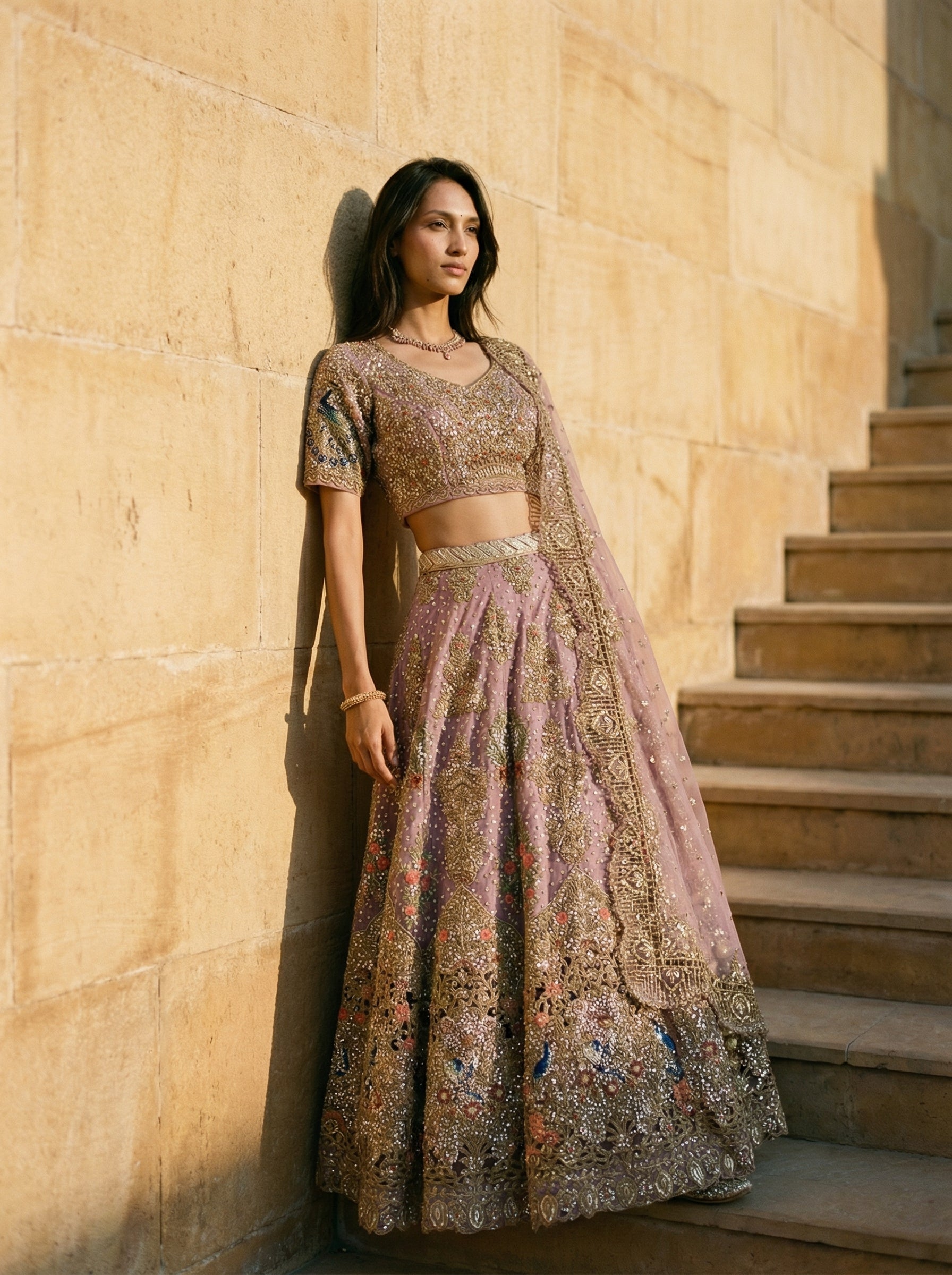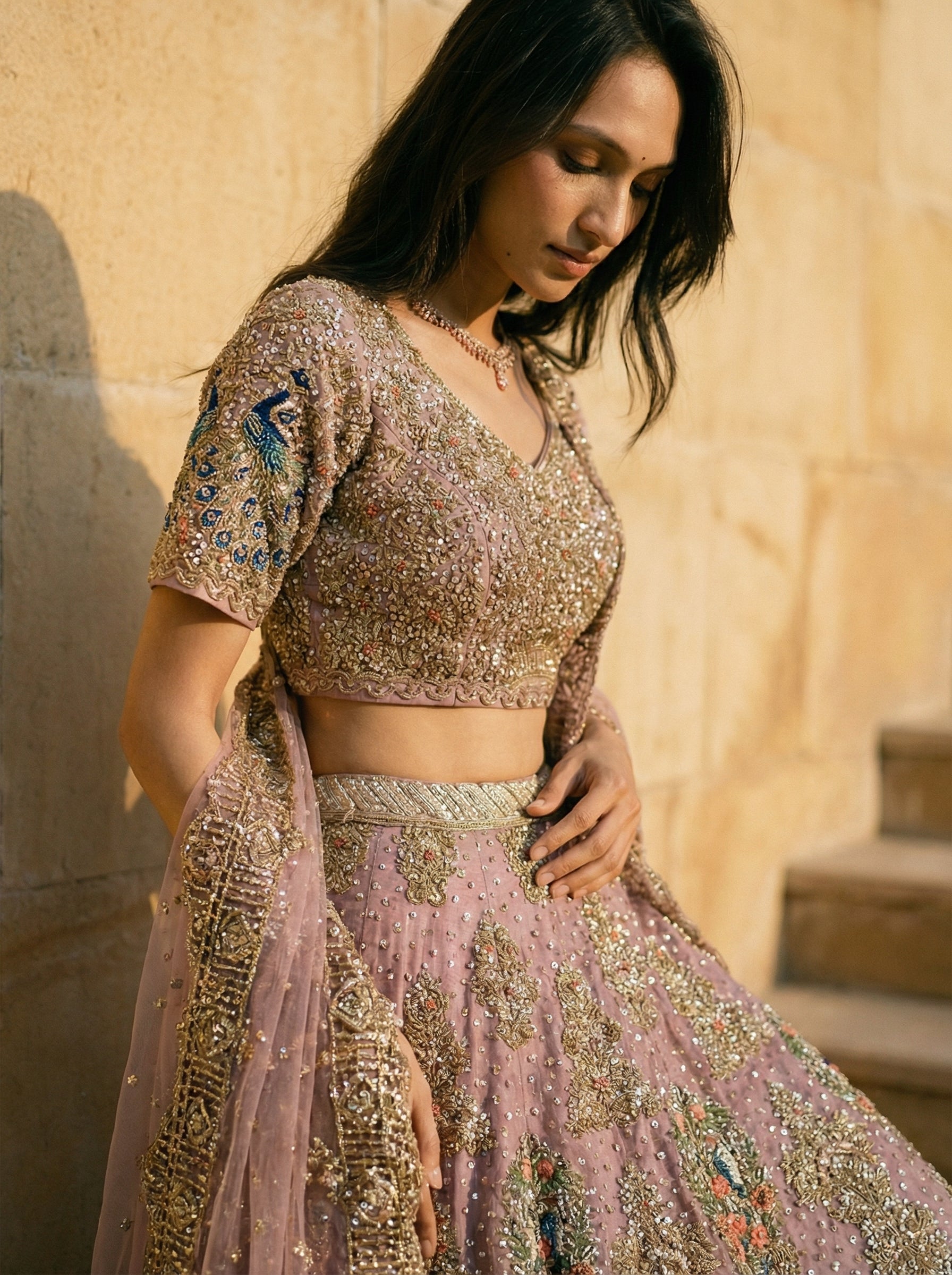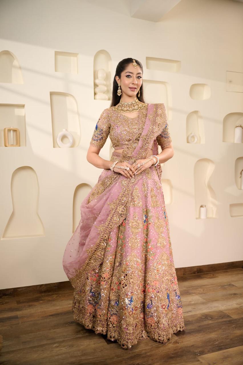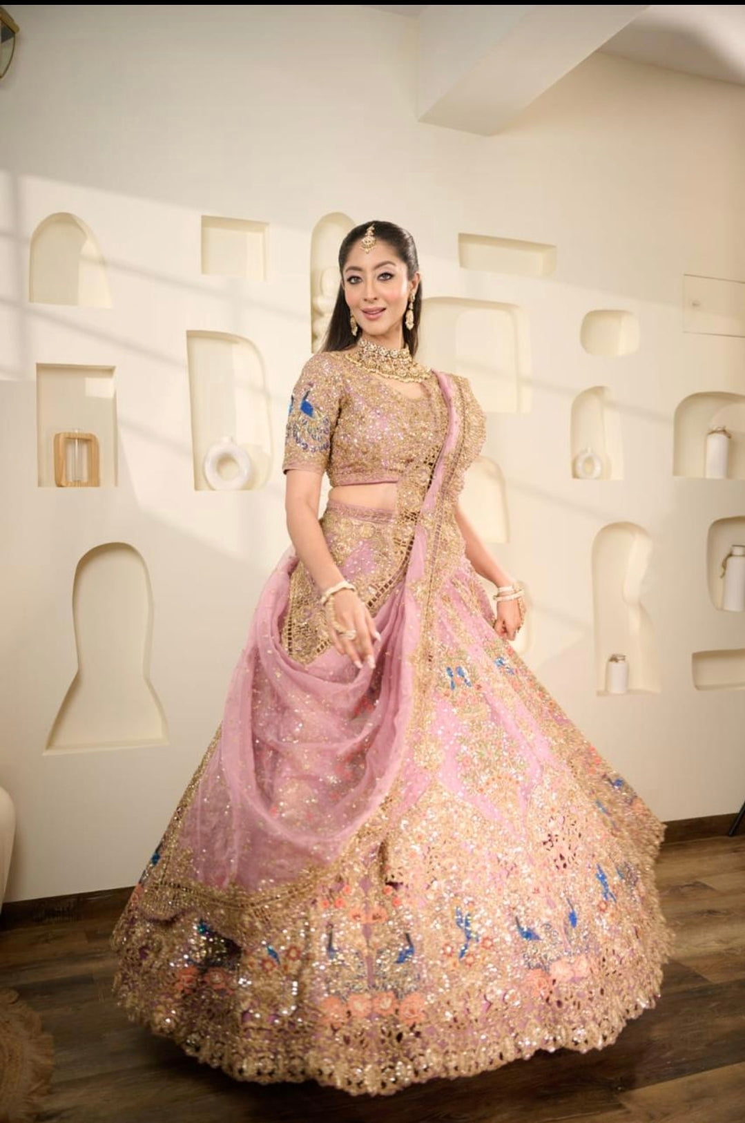 Step into regal elegance with this stunning pastel pink bridal lehenga from Zeel. Intricately hand-embroidered with golden zari, sequins, and multi-colored threadwork, this ensemble is a masterpiece of craftsmanship. The richly adorned blouse features a flattering neckline and half sleeves, perfectly complementing the heavily flared skirt that adds drama and grace to every step. Paired with a sheer, embellished dupatta draped in classic style, this lehenga is ideal for weddings, receptions, or any grand celebration.